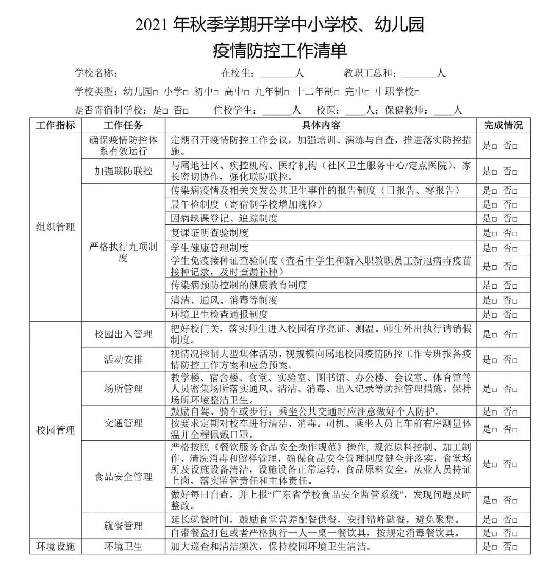 (二)加快完善新學(xué)期學(xué)校疫情防控工作方案,細(xì)化防控工作舉措。各地各學(xué)校要按照屬地政府的統(tǒng)一部署,根據(jù)疫情常態(tài)化防控要求,按照“一地一策”“一校一策”,重點(diǎn)人員“錯(cuò)區(qū)域、錯(cuò)層次、錯(cuò)時(shí)、錯(cuò)峰”返校等原則,制訂、細(xì)化開學(xué)師生返校安排、疫情防控準(zhǔn)備等工作方案,重點(diǎn)制定有針對(duì)性、可操作性的學(xué)校大規(guī)模核酸檢測(cè)工作方案和學(xué)校封閉封控管理工作方案,將開學(xué)工作與新冠病毒疫苗接種、疫情防控等統(tǒng)籌考慮。在總結(jié)前期防控工作經(jīng)驗(yàn)的基礎(chǔ)上,對(duì)照《廣東省2021年秋季學(xué)期開學(xué)學(xué)校疫情防控工作清單》,調(diào)整疫情防控機(jī)制和策略,既要嚴(yán)格落實(shí)常態(tài)化疫情防控措施,又不能層層加碼設(shè)卡,新政策制定后應(yīng)加強(qiáng)與師生和家長(zhǎng)的溝通解釋,取得理解和配合。
