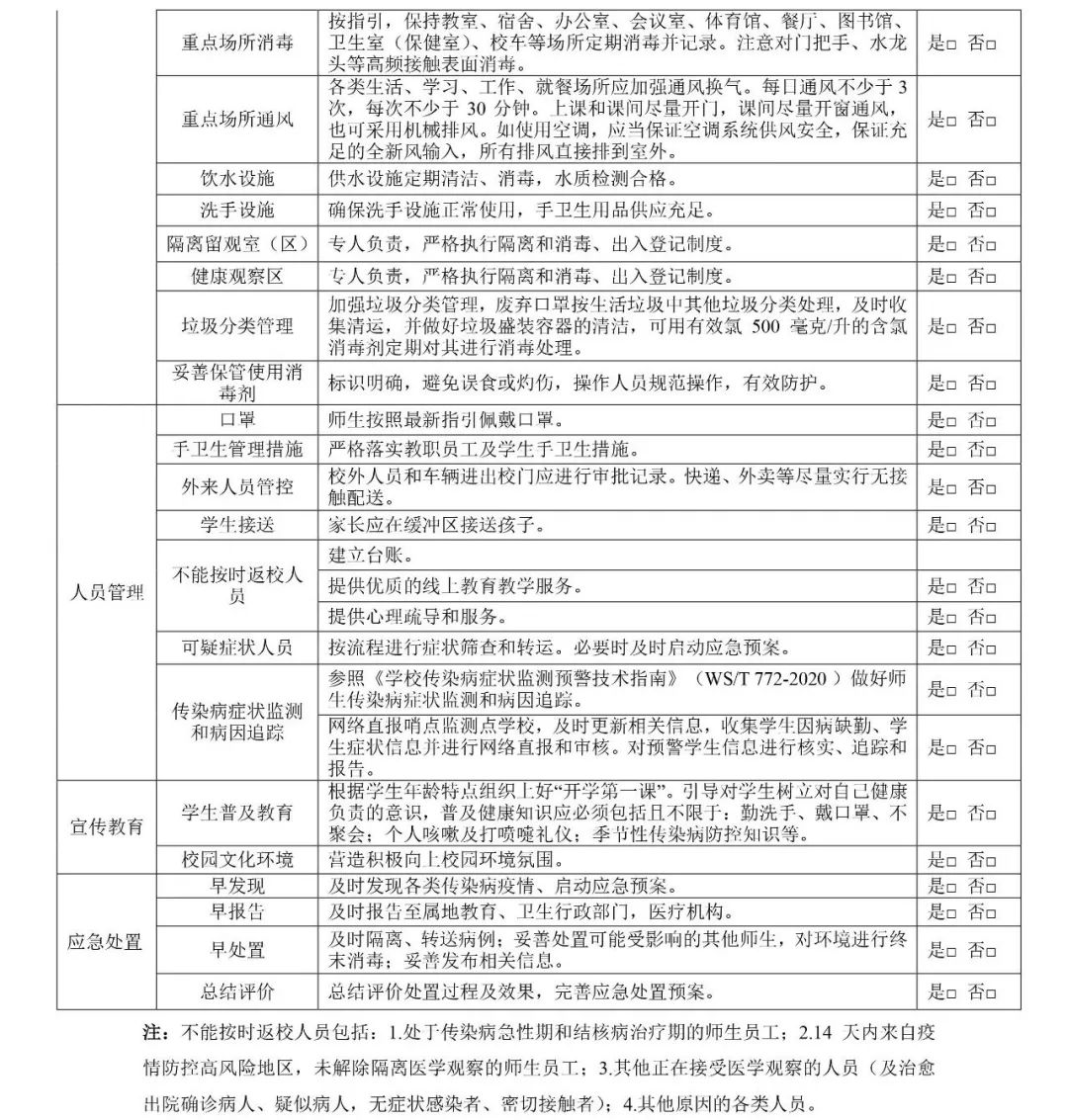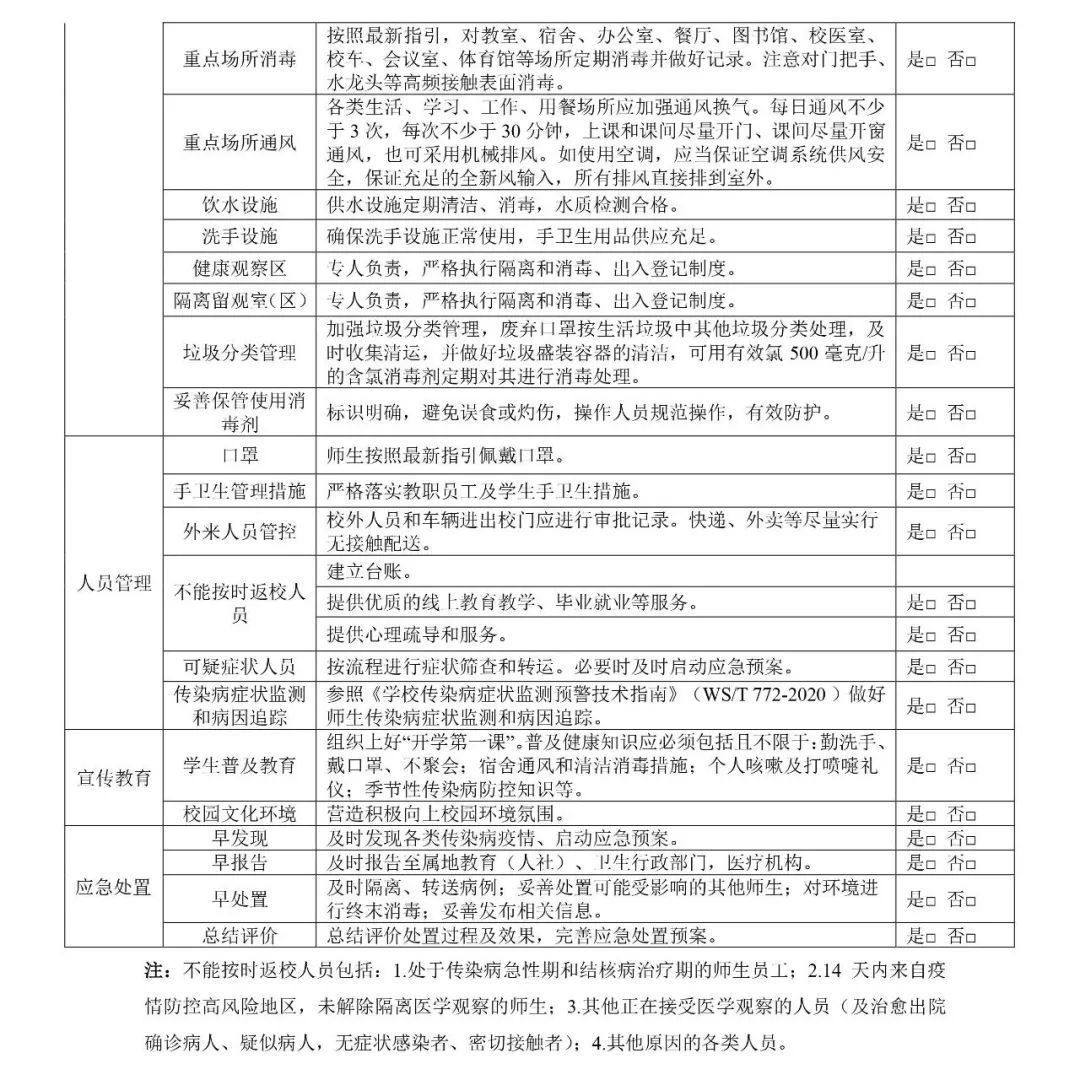各級(jí)各類學(xué)校應(yīng)對(duì)照《工作清單》,逐項(xiàng)落實(shí)疫情防控工作要求,及時(shí)查漏補(bǔ)缺,確保防控工作到位后方可開學(xué)。