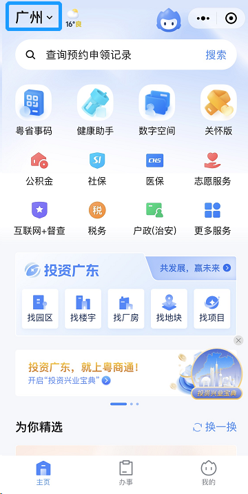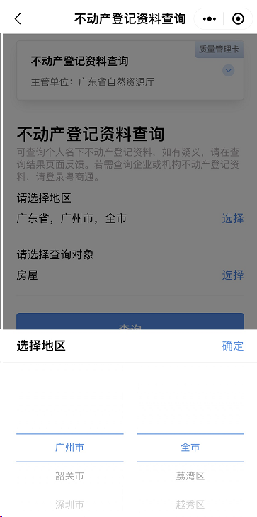 【第一步】在粵省事小程序或粵省事APP,選擇不動產(chǎn)登記所在的地市。