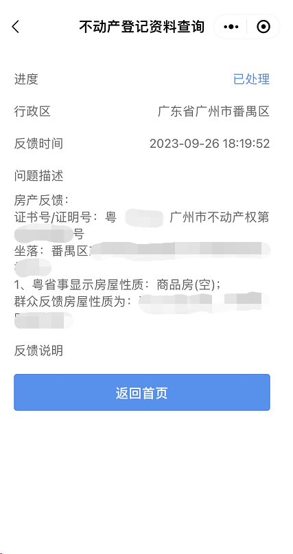 【(可選)第十一步】后續(xù)可進入查詢操作頁面,查看問題反饋的處理進度。若查看處理進度是“已處理”,可以重新查詢該筆不動產(chǎn)登記的最新信息,確認是否更正準確。