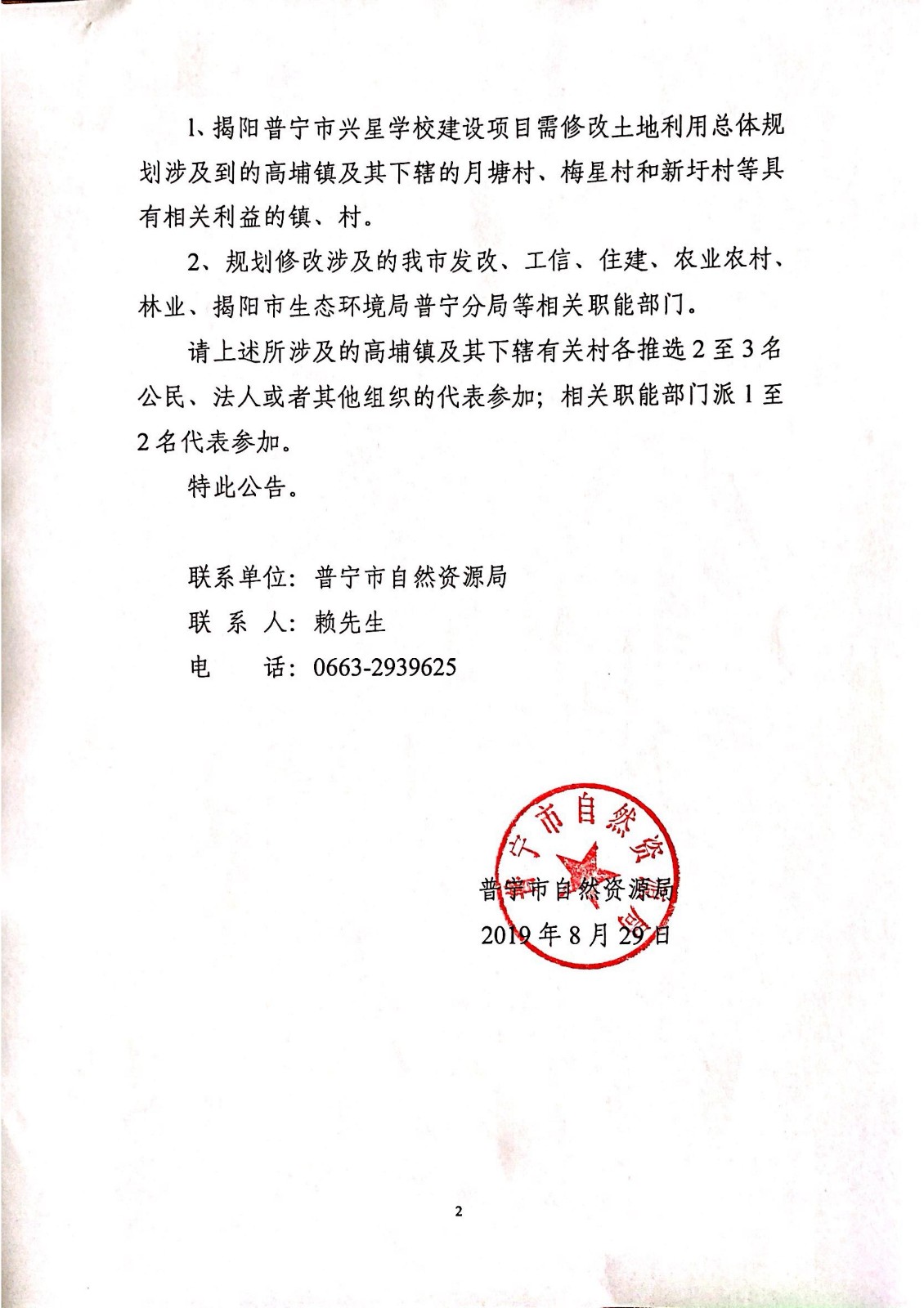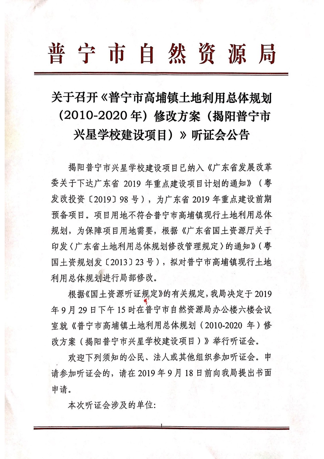 關(guān)于召開《普寧市高埔鎮(zhèn)土地利用總體規(guī)劃(2010—2020年)修改方案(揭陽普寧市興星學(xué)校建設(shè)項(xiàng)目)》聽證會(huì)公告