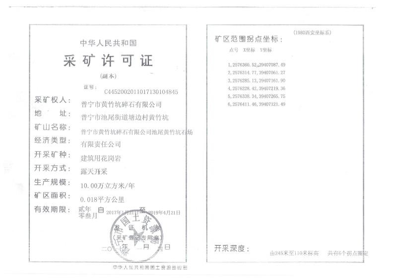 普寧市黃竹坑碎石有限公司位于我市池尾街道塘邊村黃竹坑的建筑用花崗巖礦采礦許可證(證號(hào):C4452002011017130104845)于2019年4月21日到期屆滿。礦區(qū)內(nèi)礦產(chǎn)資源消耗完畢,經(jīng)該公司申請(qǐng),根據(jù)《礦產(chǎn)資源開采登記管理辦法》(國務(wù)院令第241號(hào))規(guī)定,現(xiàn)注銷該采礦許可證。