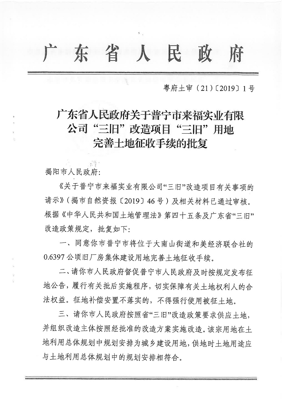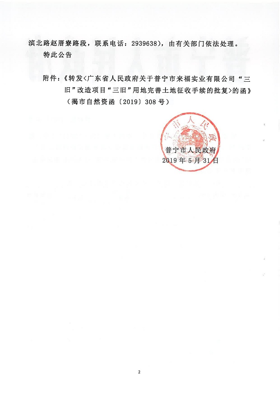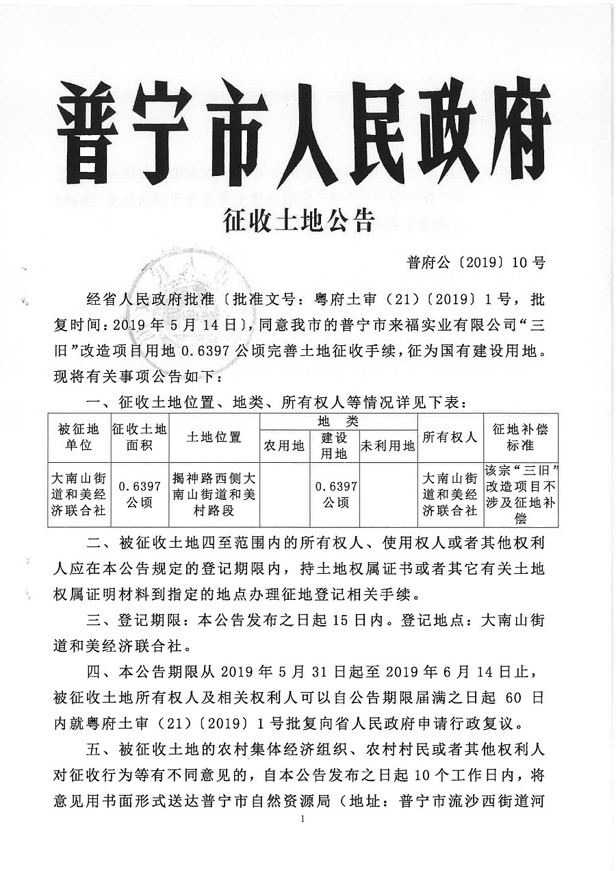 普寧市人民政府征收土地公告