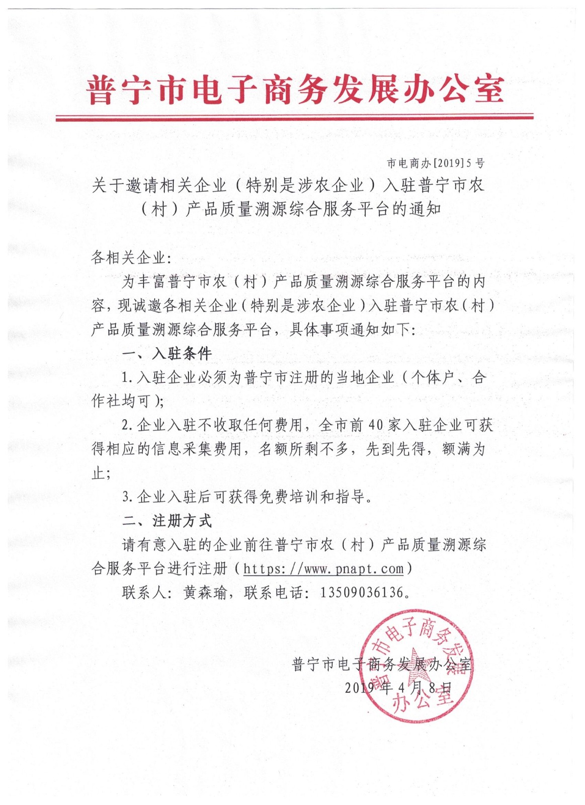 關(guān)于邀請相關(guān)企業(yè)(特別是涉農(nóng)企業(yè))入駐普寧市農(nóng)(村)產(chǎn)品質(zhì)量溯源綜合服務(wù)平臺的通知