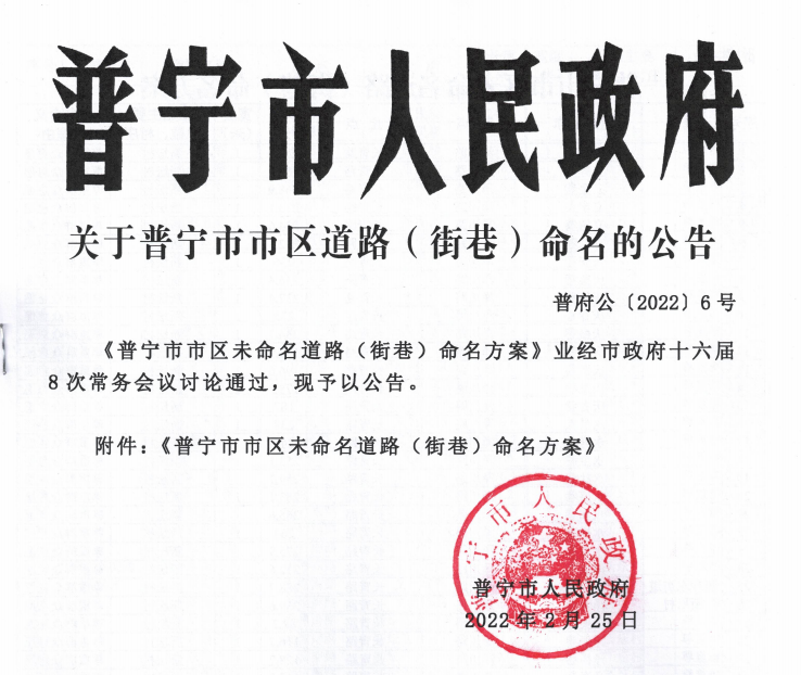 關(guān)于普寧市市區(qū)道路(街巷)命名的公告