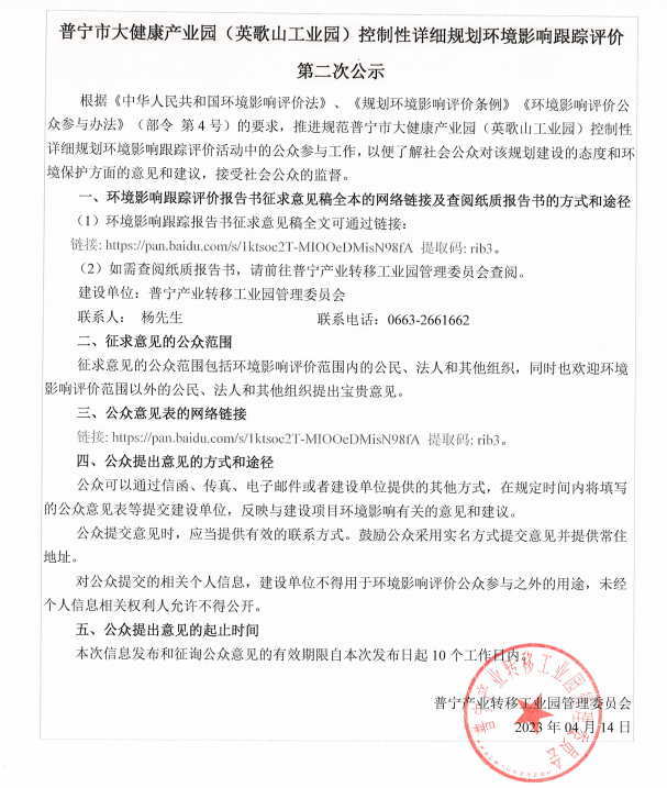 普寧市大健康產業(yè)園 (英歌山工業(yè)園)控制性詳細規(guī)劃環(huán)境影響跟蹤評價第二次公示