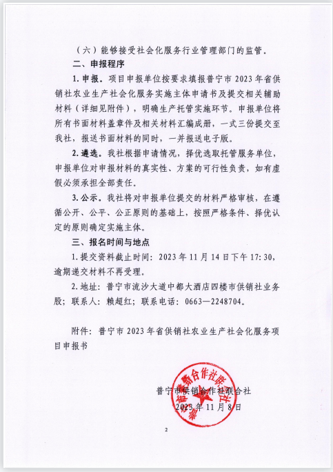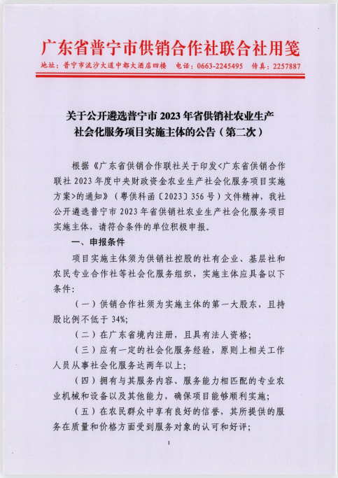 關(guān)于公開遴選普寧市2023年省供銷社農(nóng)業(yè)生產(chǎn)社會化服務(wù)項目實施主體的公告(第二次)