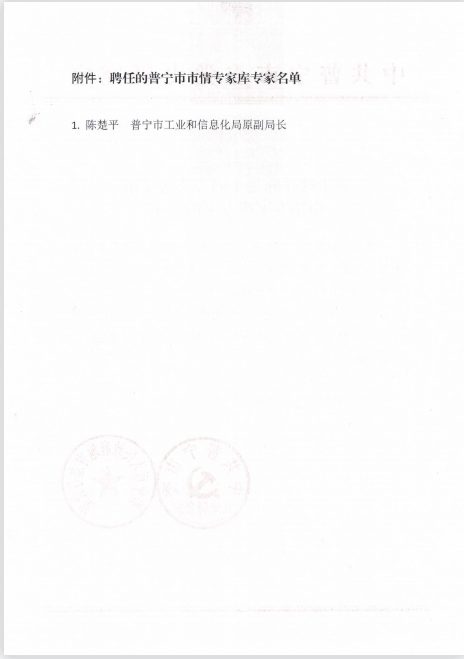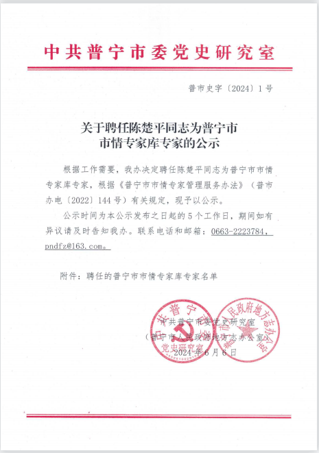 關于聘任陳楚平同志為普寧市市情專家?guī)鞂<业墓?/div>