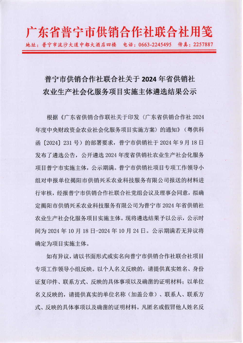 普寧市供銷合作社聯(lián)合社關(guān)于2024年省供銷社農(nóng)業(yè)生產(chǎn)社會化服務(wù)項目實施主體遴選結(jié)果公示