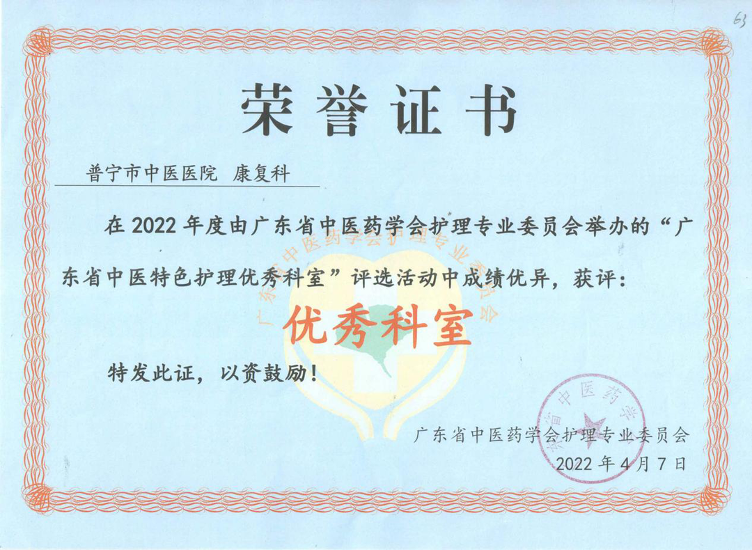 為充分發(fā)揮中醫(yī)藥的特色優(yōu)勢(shì),促進(jìn)中醫(yī)藥傳承創(chuàng)新,突出中醫(yī)護(hù)理特色,提高中醫(yī)特色護(hù)理綜合服務(wù)能力,我院康復(fù)科參加“廣東省中醫(yī)特色護(hù)理優(yōu)秀科室”評(píng)選活動(dòng),經(jīng)廣東省中醫(yī)藥學(xué)會(huì)護(hù)理專業(yè)委員會(huì)評(píng)審認(rèn)定,獲評(píng)為優(yōu)秀科室。