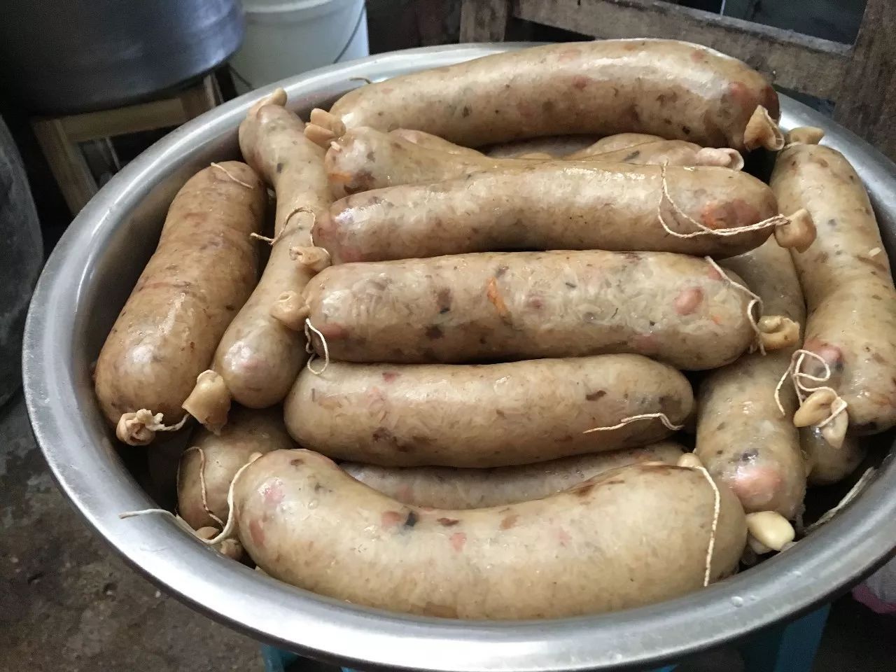 豬腸脹糯米是廣東潮汕地區(qū)普寧古城洪陽(yáng)的一種地方民間傳統(tǒng)小食。其一般制法是取豬大腸中段,用食鹽、純堿或淀粉反復(fù)搓洗至無(wú)異味,將糯米先浸軟,與豬肉、香菇、蝦、蓮子等輔料拌勻,調(diào)入食鹽、味精、胡椒粉等調(diào)味品,然后填裝入洗好的豬腸中("脹"在潮汕方言中有把東西裝入容器中的意思,"豬腸脹糯米"名稱由此而來(lái)),兩端用紗線扎緊,放開(kāi)水鍋里煮約1小時(shí),撈出斜切成小片,淋上甜醬油(醬油調(diào)進(jìn)紅糖、適量辣椒、淀粉,小煮開(kāi),撒進(jìn)炒香的白芝麻),撒上花生碎,食用。