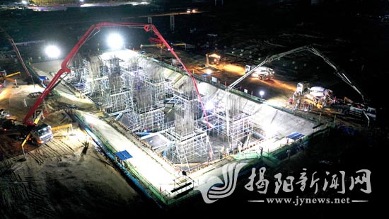 6月30日22時(shí),澆筑條件成熟,一聯(lián)合焦炭塔基礎(chǔ)承臺(tái)施工工地現(xiàn)場(chǎng)燈火通明,4臺(tái)混凝土泵車在塔基坑周圍就位,攪拌車嚴(yán)陣以待,中油一建110名建設(shè)者在基坑內(nèi)處于戰(zhàn)備狀態(tài)。22時(shí)23分,隨著現(xiàn)場(chǎng)指揮員一聲令下,混凝土泵車轟鳴,C40混凝土源源不斷地從泵車內(nèi)噴出,開(kāi)始了廣東石化煉化一體化項(xiàng)目最大體積的混凝土一次性澆筑施工。