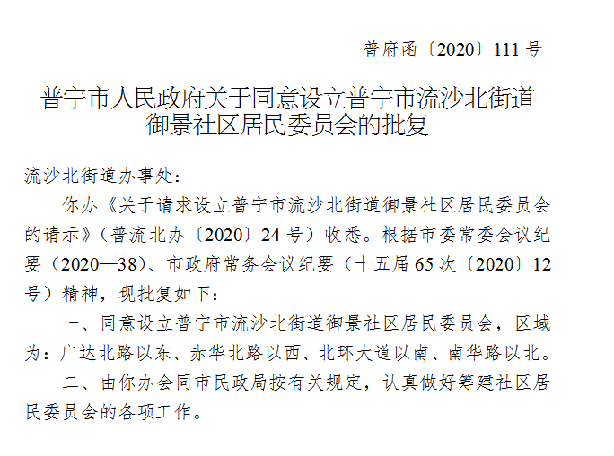 普寧市人民政府關(guān)于同意設(shè)立普寧市流沙北街道御景社區(qū)居民委員會(huì)的批復(fù)
