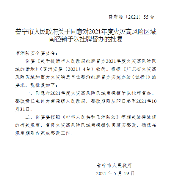 普寧市人民政府關于同意對2021年度火災高風險區(qū)域南徑鎮(zhèn)予以掛牌督辦的批復