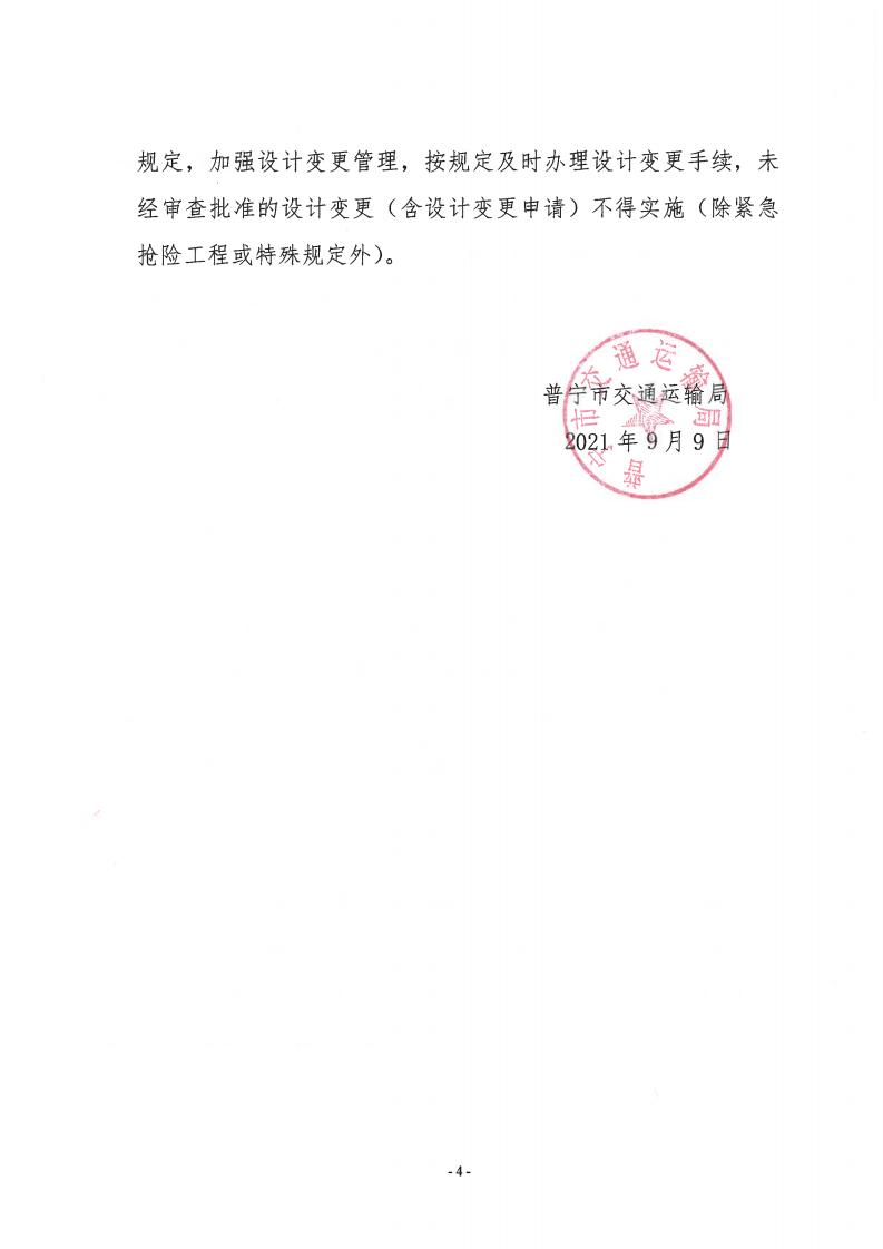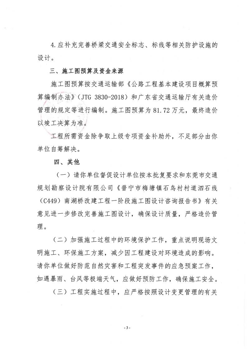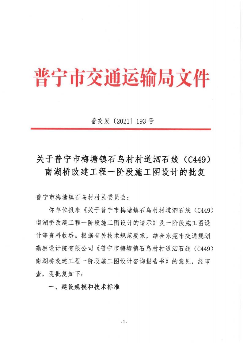 關(guān)于普寧市梅塘鎮(zhèn)石鳥村村道泗石線(C449)南湖橋改建工程一階段施工圖設(shè)計的批復(fù)